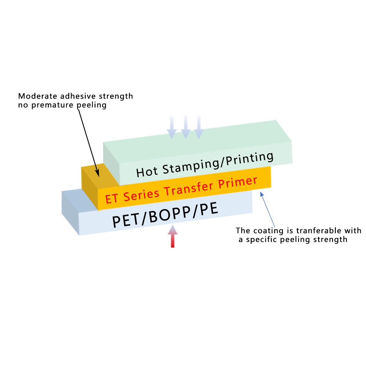 ET series water-based transfer coating is suitable for coating on PET film materials.water can be used as diluent, its dry film formation, good printing performance, and the bonding strength and PET is moderate will not peel in advance, and according to customer needs and adjust the following: